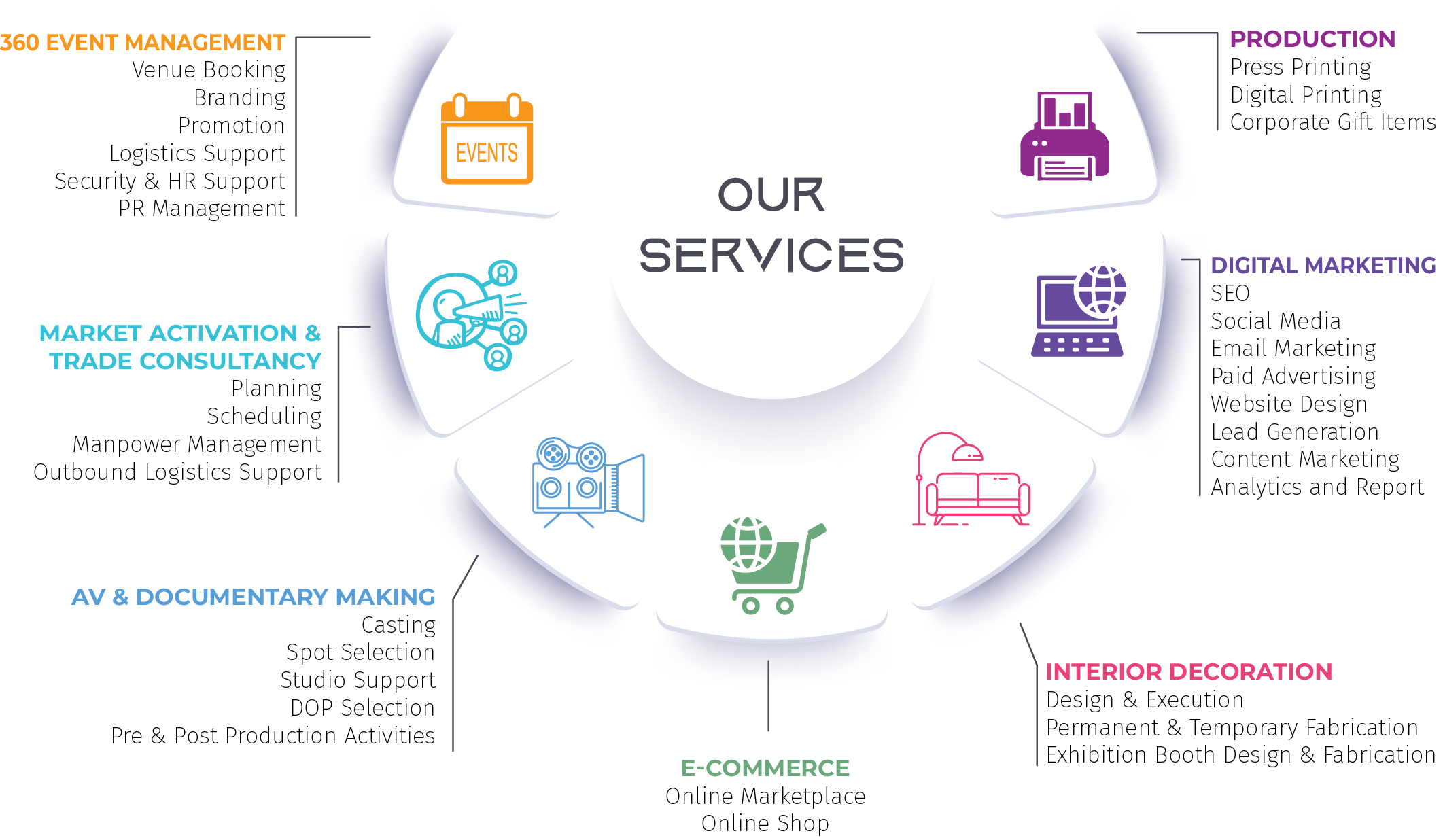 Our approach is driven by collaboration and expertise. Each arm of our organization is led by a dedicated SquadLeader, ensuring specialized focus and exceptional results in event management, exhibition organizing, interactive marketing campaign management, public relations, brand activation, production & publication, interior design, trade consultancy and more.
